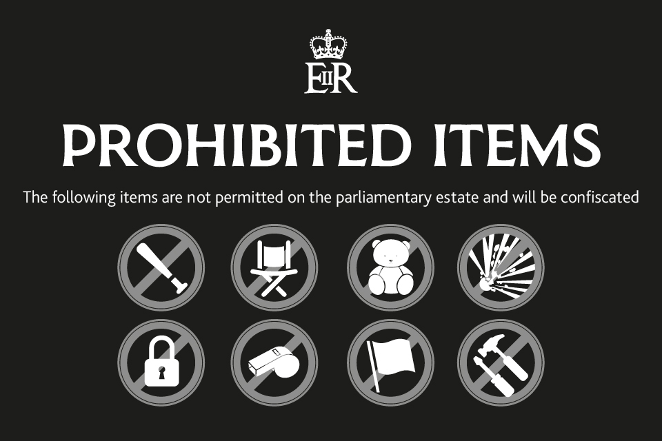 - Food and liquid of any kind. Any food or liquids must be consumed in the queue or disposed of before you enter the security search point at the Palace of Westminster.