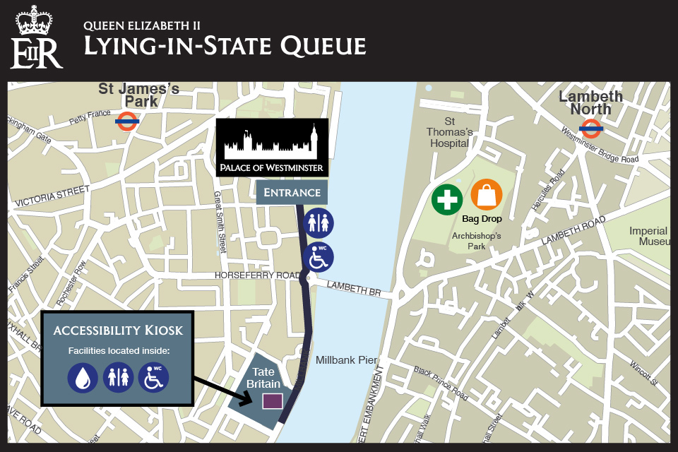 The accessible queueing scheme opens at 5pm on Wednesday, 14 September. It will be open 24 hours a day until the Lying-in-State closes at 6.30am on Monday 19 September. Please note that the queue may close early to ensure as many visitors in the queue as possible can enter the Palace before the Lying-in-State period comes to an end.