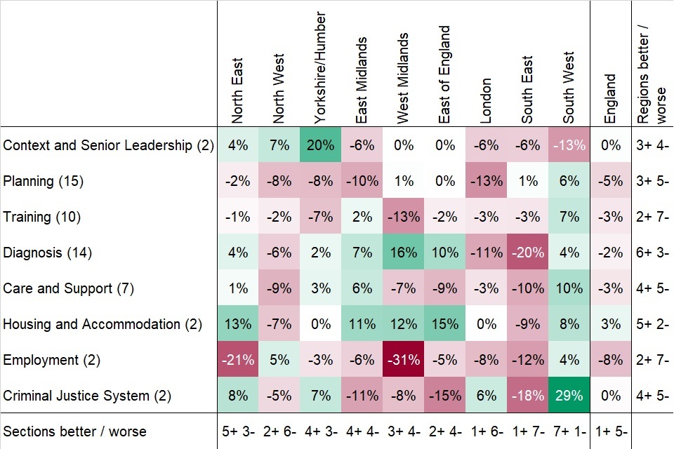 For England as a whole, only 1 of the 8 sections of the self-assessment, housing and accommodation, showed overall net positive movement. For this section, 5 regions showed net positive movement, 21 showed net negative movement and 2 showed no net movement.