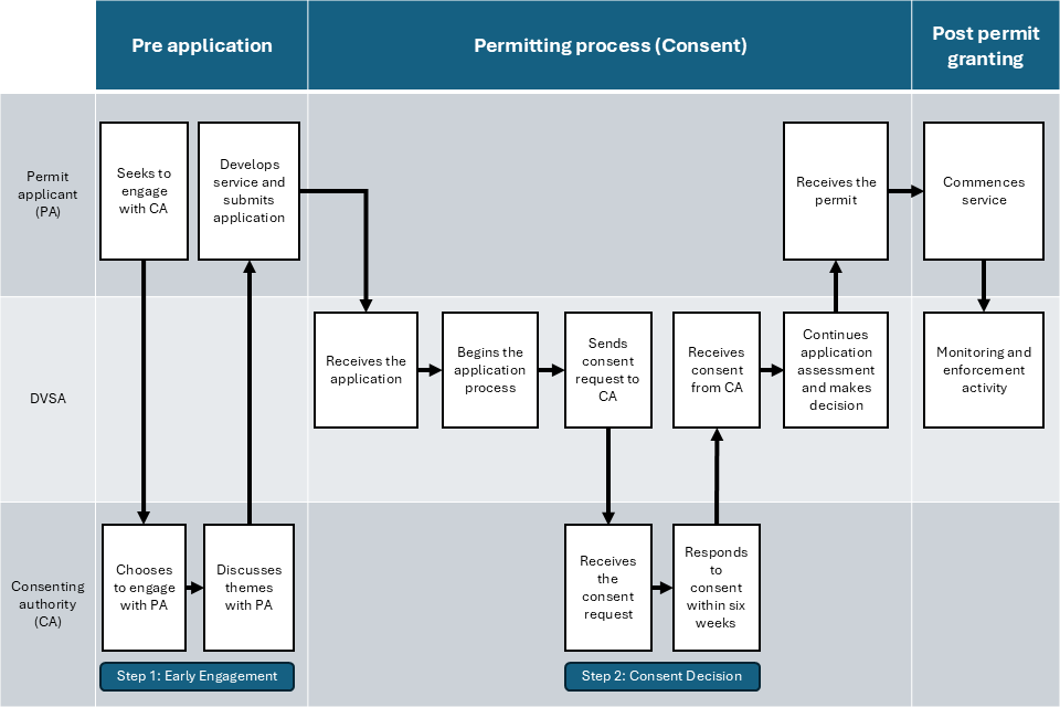 Any early engagement is outside the formal bounds of the consent process, so does not have any time limit. Pre-consent engagement could happen up until DVSA sends the consenting authority a formal request for consent, allowing the applicant to amend details of its service as feedback is received.