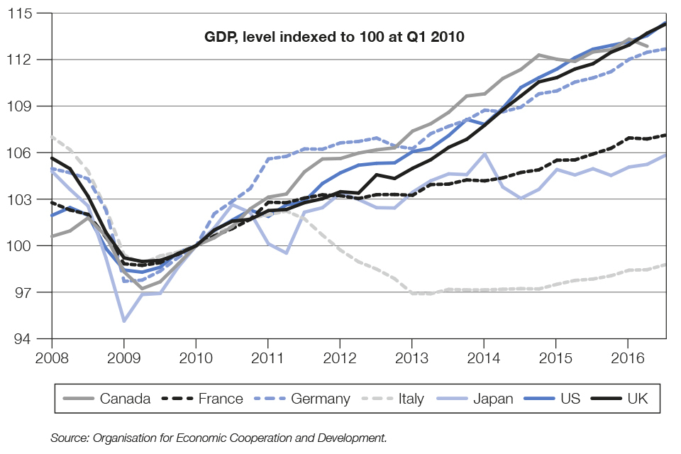 Government action since 2010 has helped to ensure that the fundamentals of the economy are strong. The government has taken steps to improve growth prospects and reduce the deficit, putting the economy on a sound footing. In recent years, the UK economy has grown at a faster pace than other major advanced economies, which has supported strong gains in employment. As data released since the EU referendum have shown, the economy has been resilient. Gross Domestic Product (GDP) grew at a solid rate through the first three quarters of 2016, and employment and living standards have continued to rise.[footnote 1]