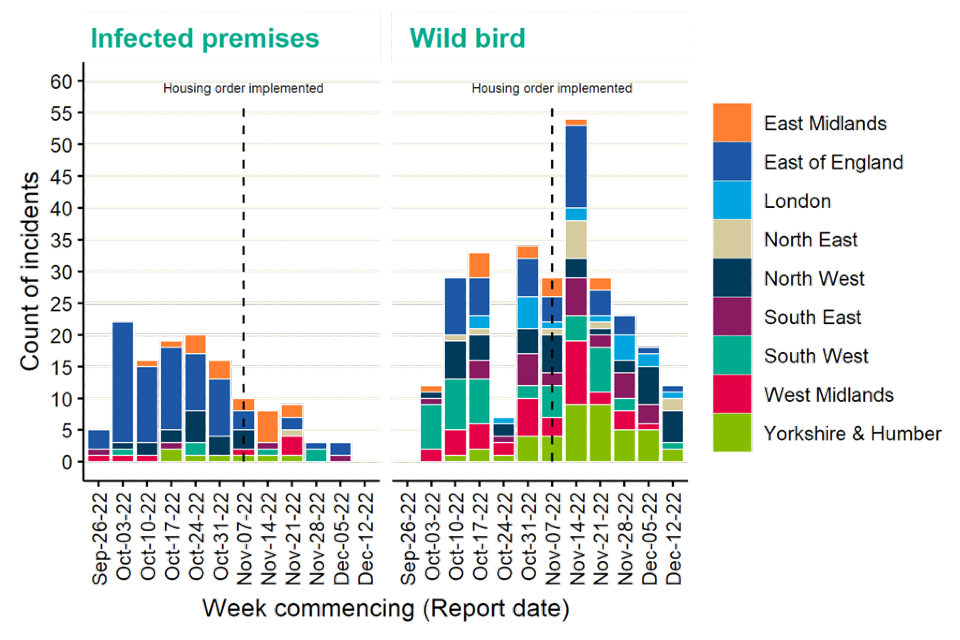 Detections of avian influenza at infected premises have continued through the reporting period and have fluctuated during this time (Figure 1). A national housing order for poultry was introduced on 7 November 2022. Wild bird detections have continued to demonstrate that the background risk from avian influenza in wild birds remains very high (Figure 1).