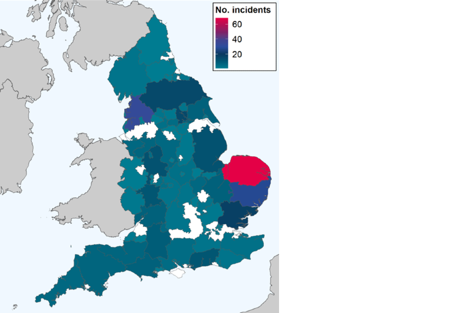 Figure 2. Choropleth map of avian influenza incidents detected in poultry and wild birds across England by upper tier local authority (UTLA), from 1 October 2022 to 13 December 2022