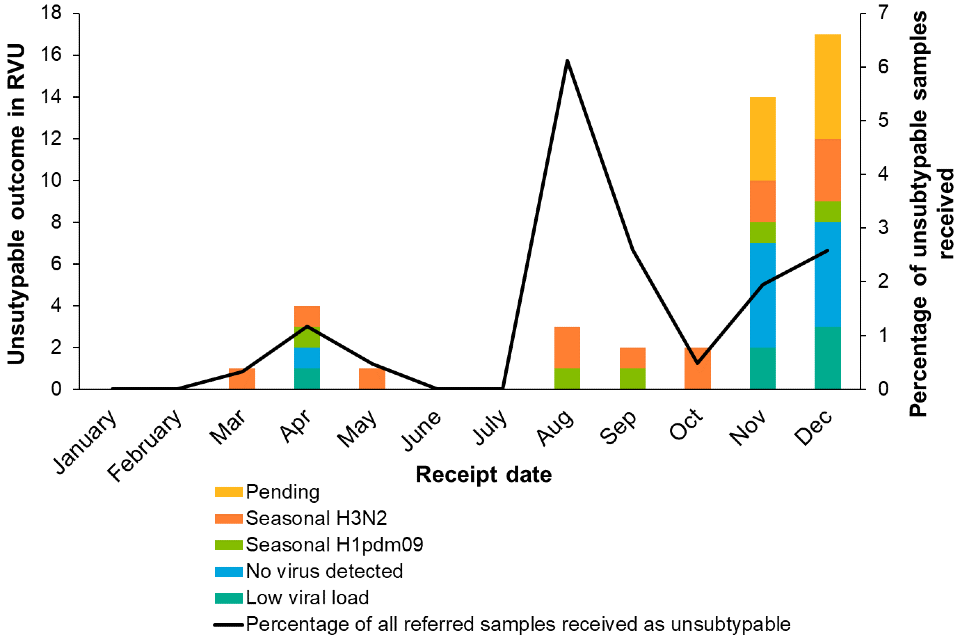 Some clinical and regional public health laboratories undertake influenza subtyping and refer influenza A which is unsubtypable by standard clinical assays to UKHSA for characterisation. From 1 January 2022 to 8 December 2022, 44 samples were referred to UKHSA as unsubtypable and of these 18 were seasonal H1 or H3 viruses, 11 had no virus detected, 6 had a low viral load precluding further characterisation, and 9 are still being characterised. Assessment of the sensitivity and completeness of this system for the detection of novel influenza viruses is being undertaken.