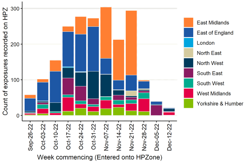 Details of exposed individuals are recorded on the HPZone case management system at UKHSA. HPZone was interrogated from 1 October 2022 to 15 December 2022. Data was selected for analysis where the infectious agent was ‘avian influenza’.