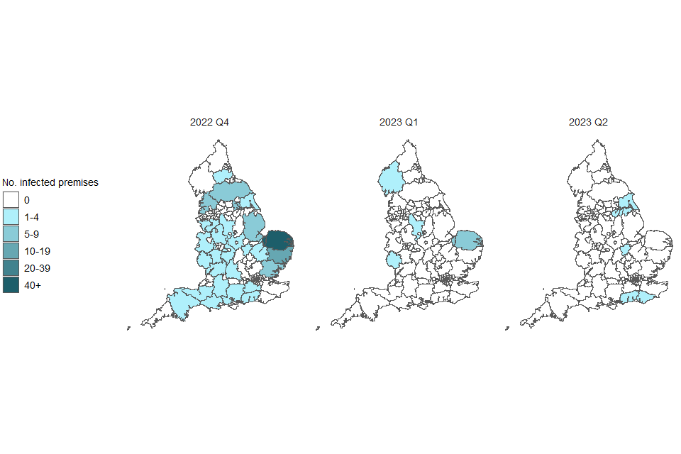 Figure 1a. Confirmed detections of avian influenza at infected premises by quarter in England from 1 October 2022 to 4 July 2023. Data provided by APHA