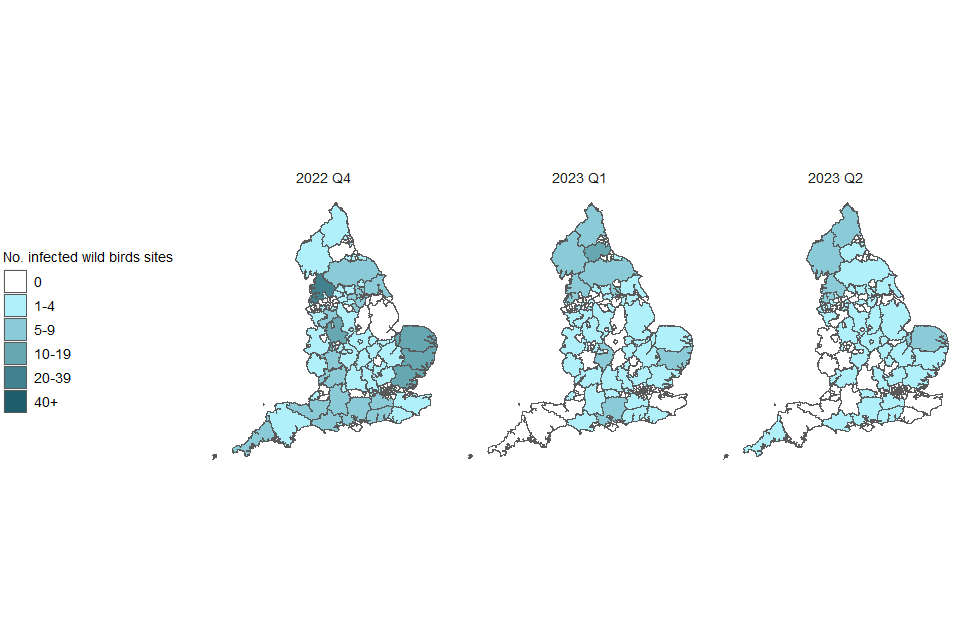 Figure 1b. Confirmed detections of avian influenza in wild birds by quarter in England from 1 October 2022 to 4 July 2023. Data provided by APHA