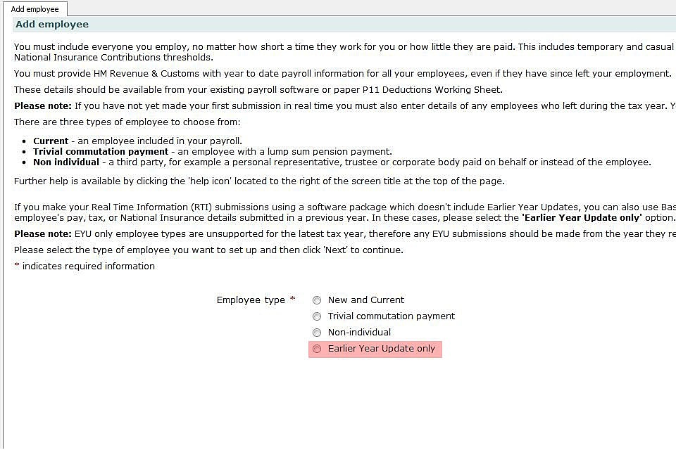 Read the guidance on the next screen and then select ‘Add an Earlier Year Update’ to continue.