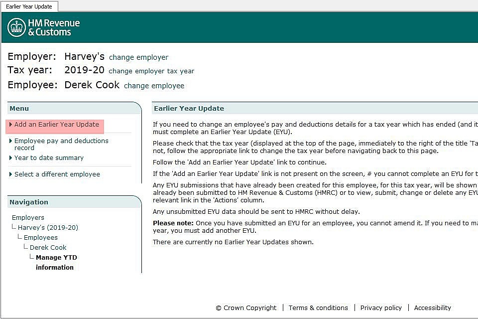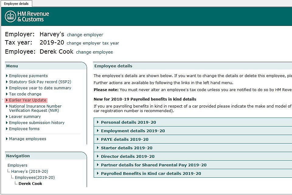 From the ‘Employee details’ screen, select ‘Earlier Year Update’ from the menu.
