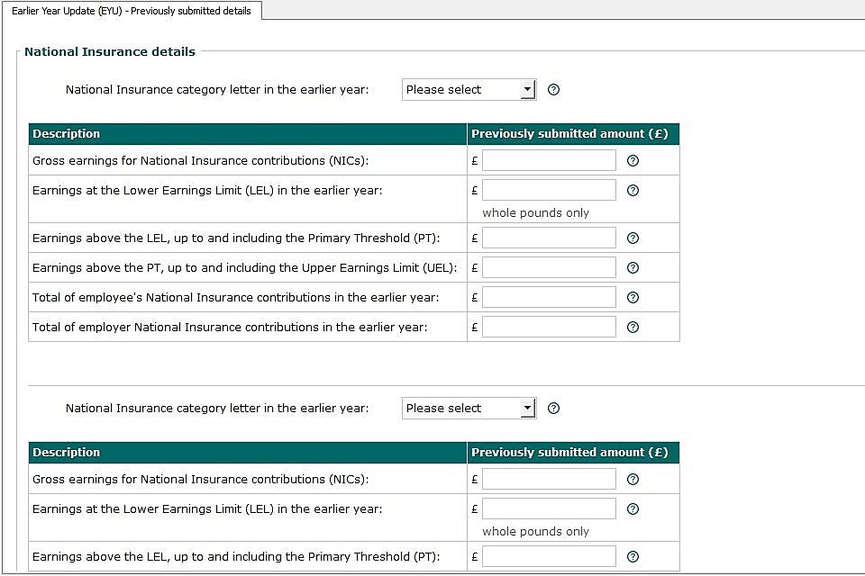 In the boxes labelled ‘National Insurance details’ enter the National Insurance category letter and amounts of earnings liable to National Insurance. For example, earnings at the lower earnings limit, that were previously submitted to HMRC, if they now need amending.