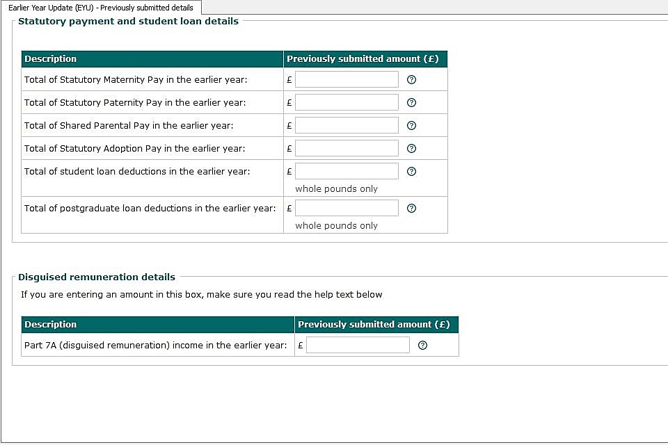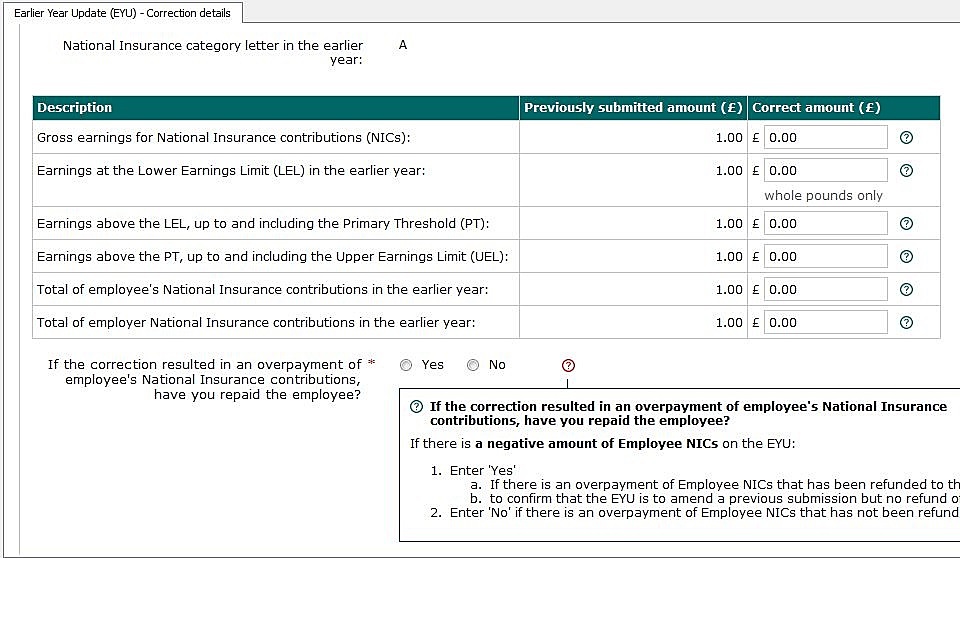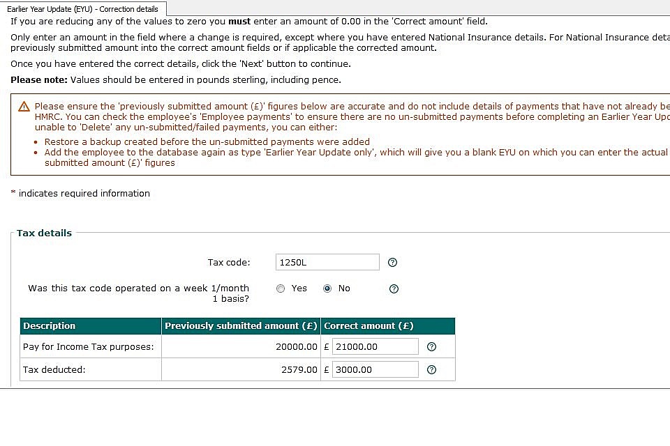 If you then realise the final pay figure should have been £11,000 you should generate a further EYU using ‘Previously submitted amount’ of £12,000 and £11,000 as the ‘Correct amount’.