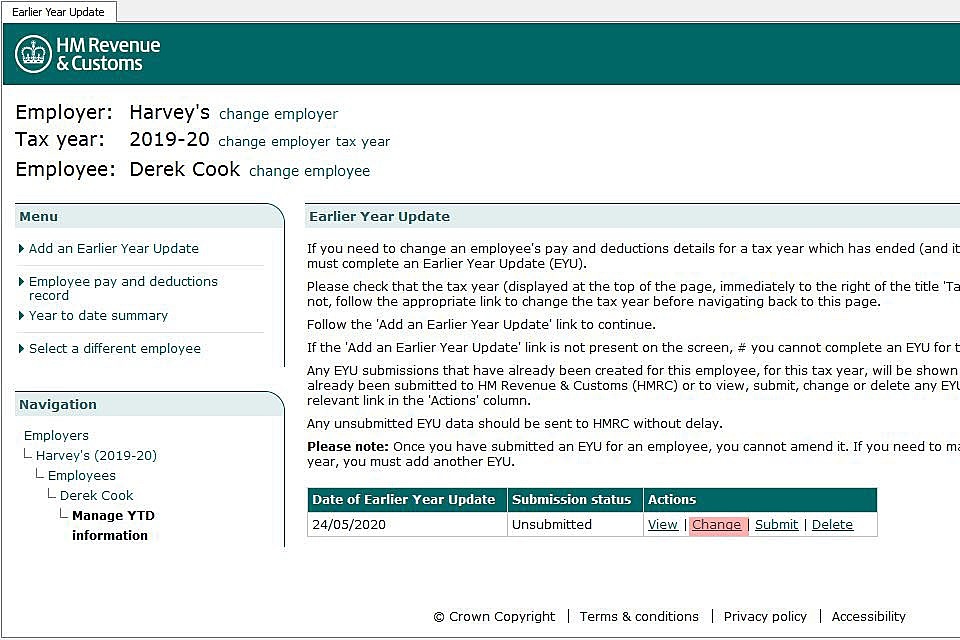 To do this you should select the relevant employee from the menu, then select ‘Earlier Year Update’ from the menu. From the EYU unsubmitted submissions select change as shown in the screen and amend the amounts as necessary.