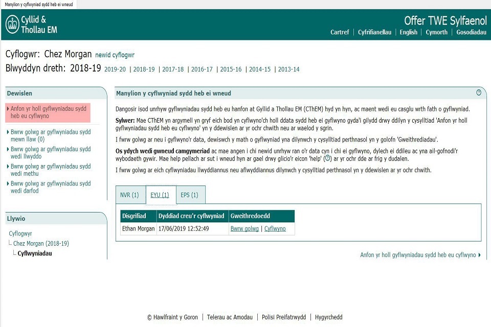 Os nad ydych wedi cyflwyno’r EYU hyd yn hyn, gallwch wneud y naill neu’r llall o’r canlynol: