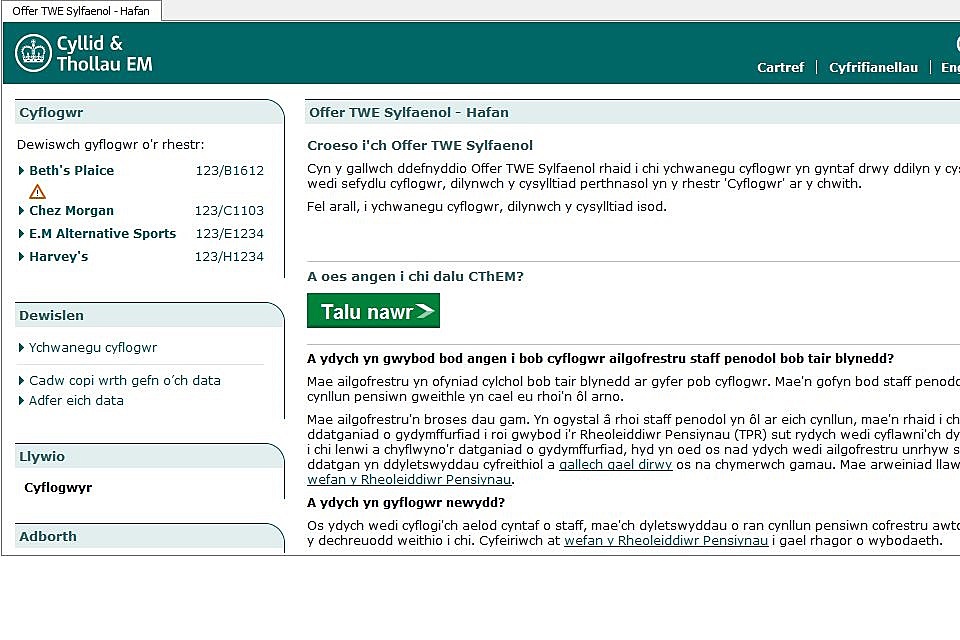 Bydd hyn yn mynd â chi i’r sgrin ‘Manylion y Cyflogwr’ fel y dangosir isod.