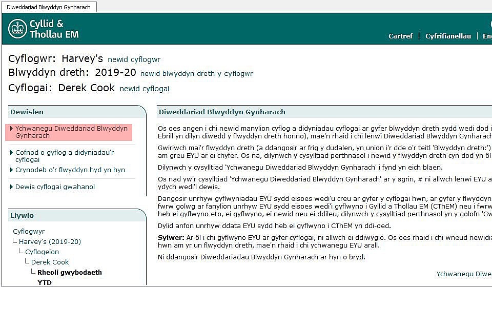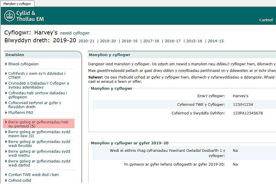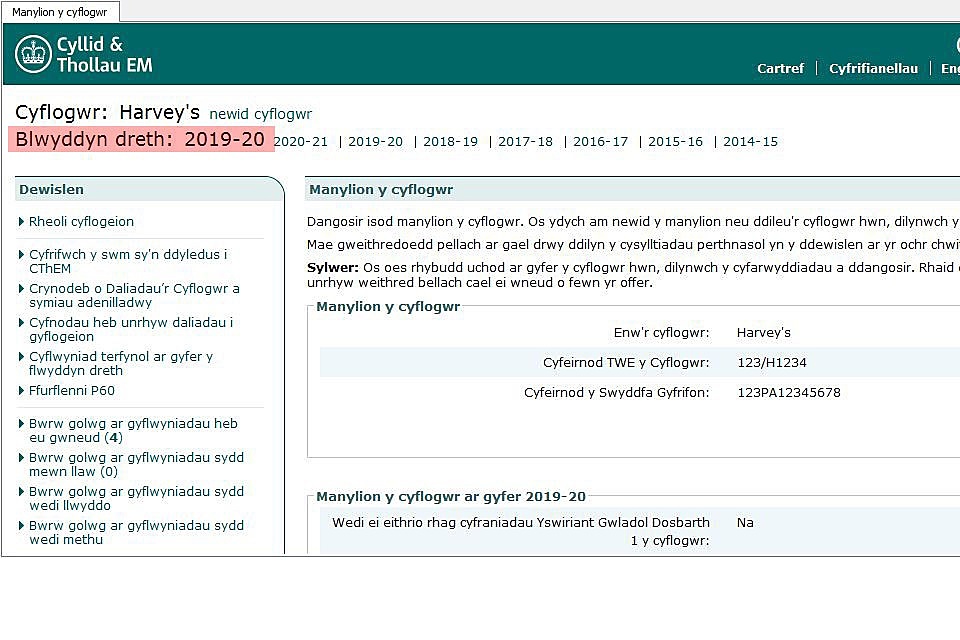 Gwiriwch fod y flwyddyn dreth gywir wedi ei dewis, dangosir hyn yn y blwch coch yn yr enghraifft isod.