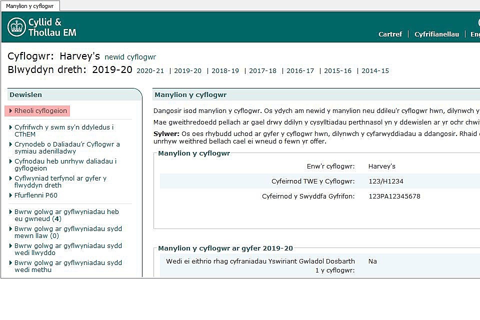 Bydd hyn yn mynd â chi i’r sgrin ‘Manylion y cyflogwr’.