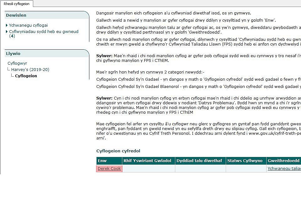 Dewiswch y cyflogai perthnasol o’r rhestr.