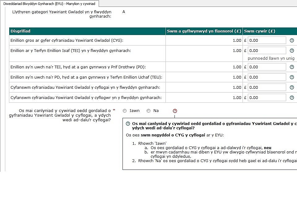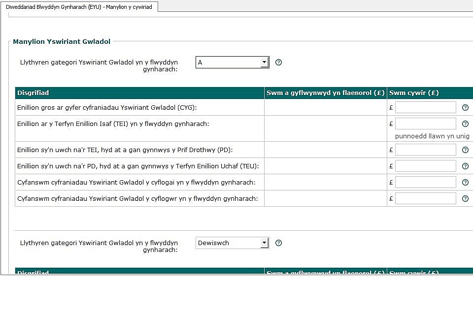 Pwrpas y sgrin hon yw rhoi cyfle i chi nodi’r symiau cywir pan fo’r naill neu’r llall o’r canlynol yn gymwys: