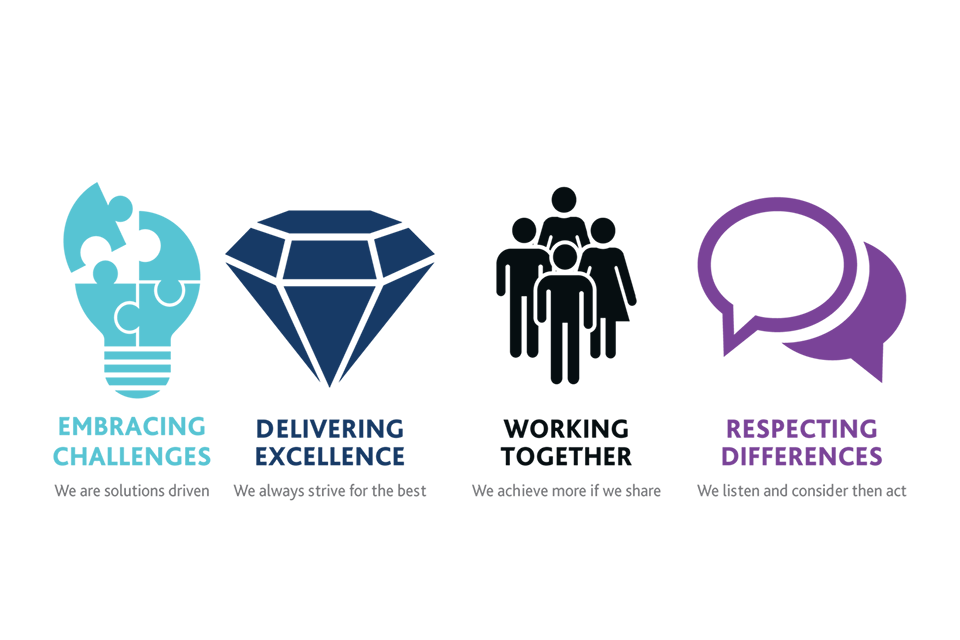 To achieve our goals, our work is underpinned by four core values: Embracing Challenges, Delivering Excellence, Working Together and Respecting Differences.