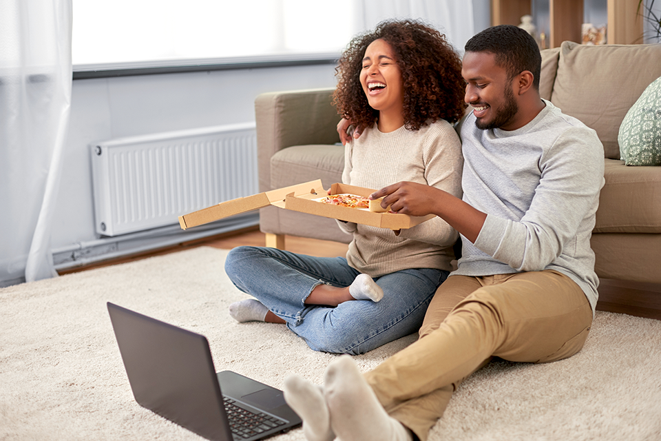 A couple watching something on their laptop, sat on the floor whilst eating a pizza