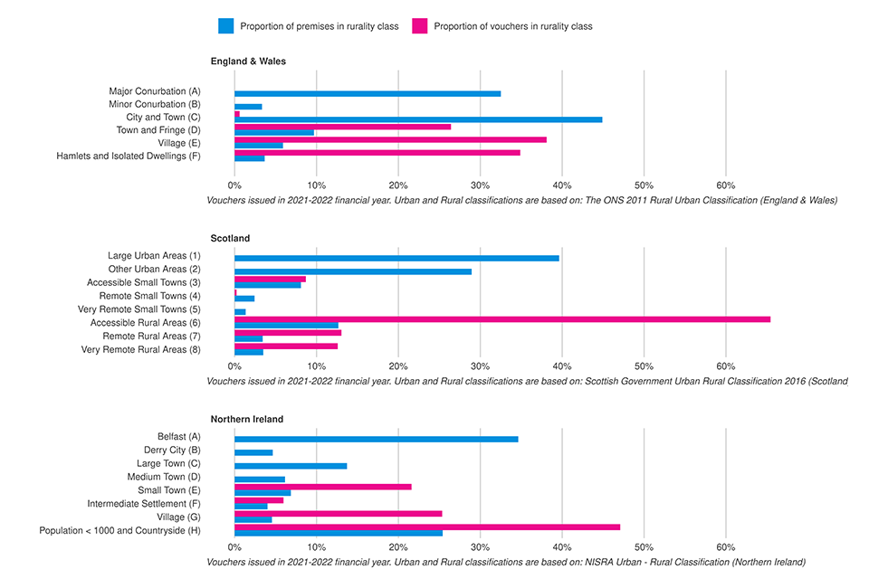 Our analysis of vouchers issued between April 2021 and March 2022 in Chart 1 shows that the majority of vouchers were issued in the most rural parts of England, Wales, Scotland and Northern Ireland.