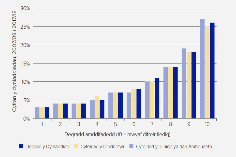 Ond, nid yw hon yn realiti sy’n cael ei chydnabod gan y cyhoedd ac rydym yn rhannu eu penderfyniad i weld brwydr o’r newydd yn erbyn troseddu ac ymddygiad gwrthgymdeithasol. Gwyddom nad yw pawb wedi mwynhau gostyngiadau mewn troseddu yn gyfartal yn y degawdau diwethaf. At hynny, tua diwedd y cyfnod hwn, dechreuodd rhai mathau o droseddau godi. Cododd dynladdiad o 35% rhwng 2013-14 a 2016-17[footnote 4]. Cafwyd cynnydd o 41% hefyd yn nifer y derbyniadau i’r ysbyty ar gyfer ymosodiadau gyda gwrthrych miniog, sy’n ddangosydd allweddol o drais difrifol, yn Lloegr rhwng 2014-15 a 2018-19[footnote 5]. Mae troseddau cymdogaeth[footnote 6] hefyd wedi dangos rhywfaint o gynnydd, gyda chynnydd o 16% rhwng 2016-17 a 2018-19[footnote 7].