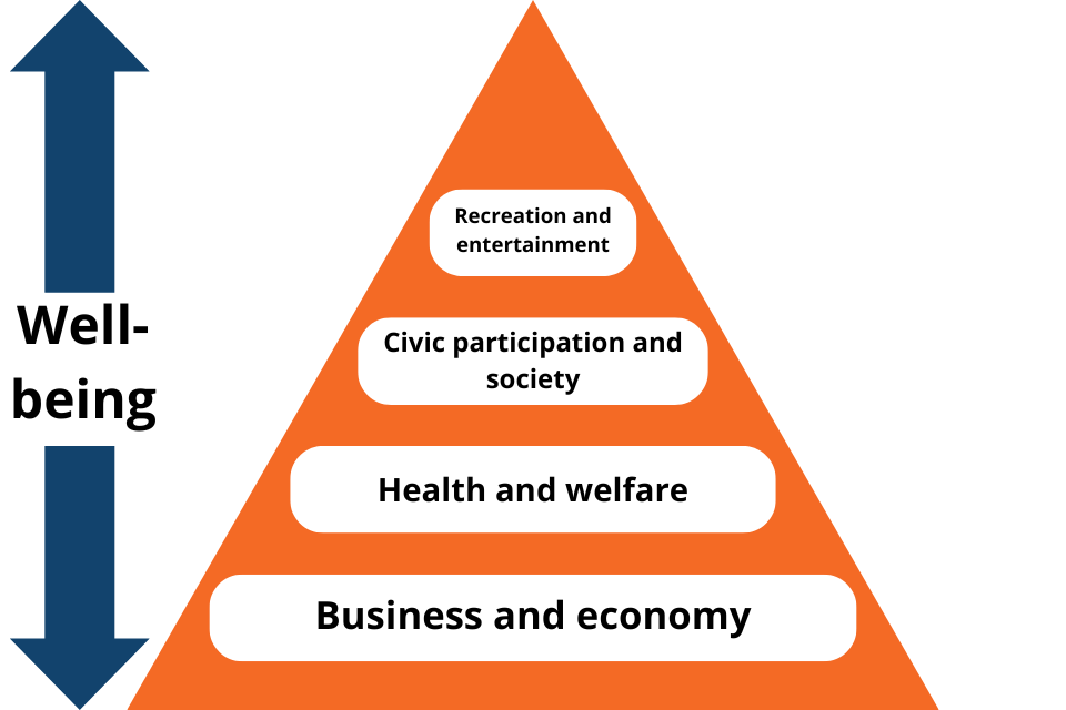 The pyramid diagram presented here is a visual representation of some of the points made here, with business and the economy as a baseline need, followed by health and wellbeing needs, followed by civic participation and society, and finally recreation and entertainment. Realising wellbeing needs should not be de-prioritised by virtue of being at the tip of the pyramid but instead perhaps viewed as an achievable outcome in terms of benefits realisation. By visualising the priorities that were apparent in this study, it is perhaps possible to build a framework by which wellbeing can be conceptualised and achieved through provision of digital infrastructure.