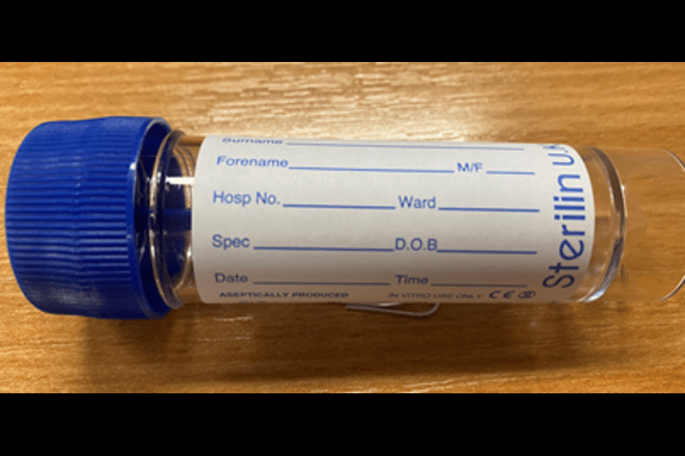 Step 3. Place the transport vial inside the cardboard transport box. Please complete the request form clearly and as fully as possible, ensuring there is a minimum of 2 patients identifiers. Include an incident (ILOG) number if possible.