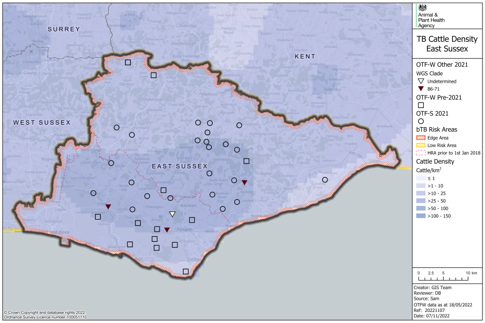 New TB incidents (21 out of 26, 81%) occurred in the highest cattle density areas of East Sussex.
