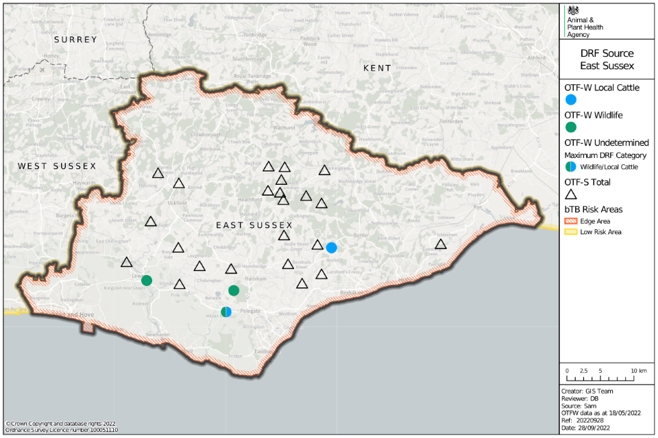 Map of East Sussex showing data points of OTF-W as circles, and OTF-S as triangles. Colour is used to denote whether the source is from local cattle, purchased, wildlife or is undetermined.