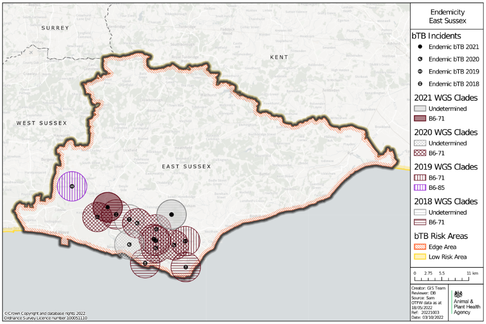 The B6-71 isolate in the original Edge Area was considered to be likely linked to either residual infection in the herd or movements from East Sussex Edge Area, based on the epidemiological information from the DRF.