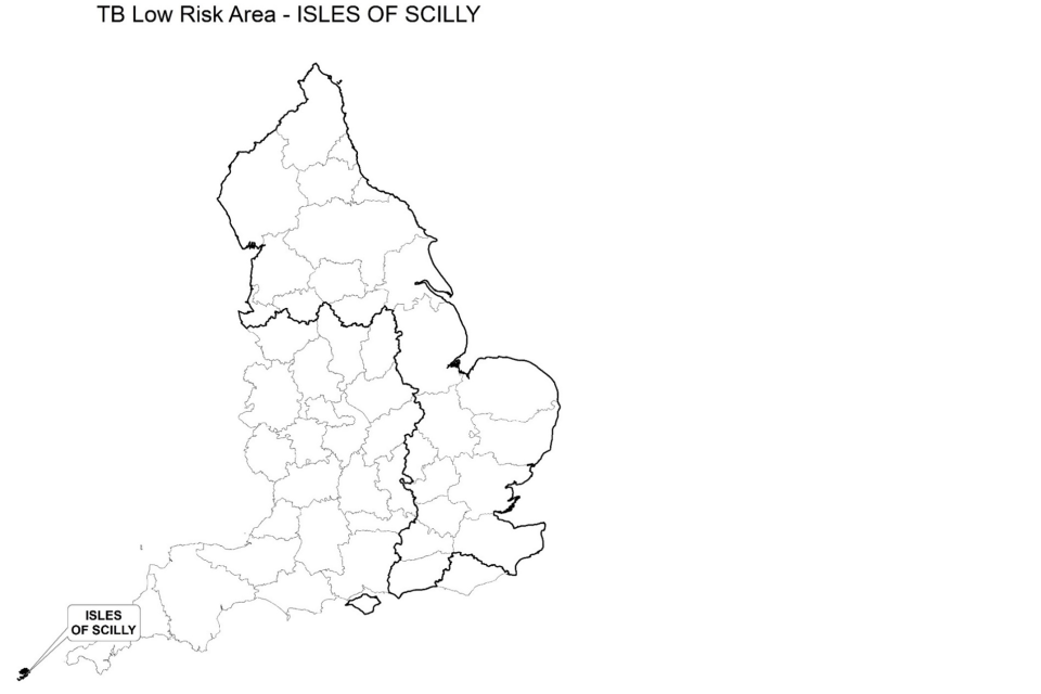 County map of England showing the Low Risk Area and highlighting the Isles of Scilly.