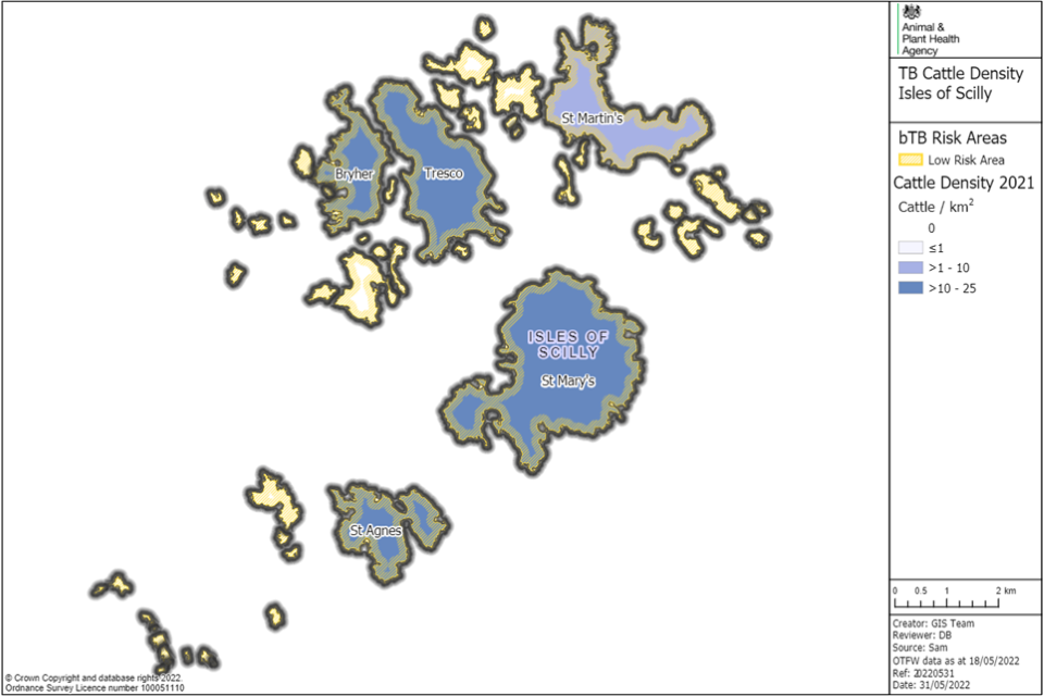 The Isles of Scilly are a small archipelago situated 28 miles south-west of the Cornish peninsula. Five of the islands are populated and they have their own independent council. In 2021 there were 19 herds (using RADAR data, see Appendix 1) or 22 herds (using Sam data, see Appendix 2) registered, with 264 cattle between them. Figure 1 displays cattle density in the Isles of Scilly in 2021. There is a small amount of trade between the islands (designated Low Risk Area) and the Cornish mainland, which is part of the High Risk Area (HRA).