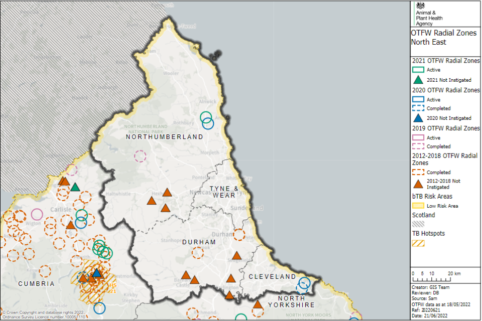 There were no potential or confirmed TB hotspot areas in any of the counties in the North East of England in 2021. Only a single new radial zone was intigated in 2021, in Northumberland; but 2 radial zones from 2020 were still active as shown in Figure 4. Two OTF-W TB incidents that gave rise to radial zones in 2020 and 2021 were in close proximity, but it was concluded that these incidents were independent and not related to one another following both APHA veterinary investigations and WGS analyses.