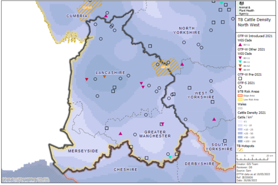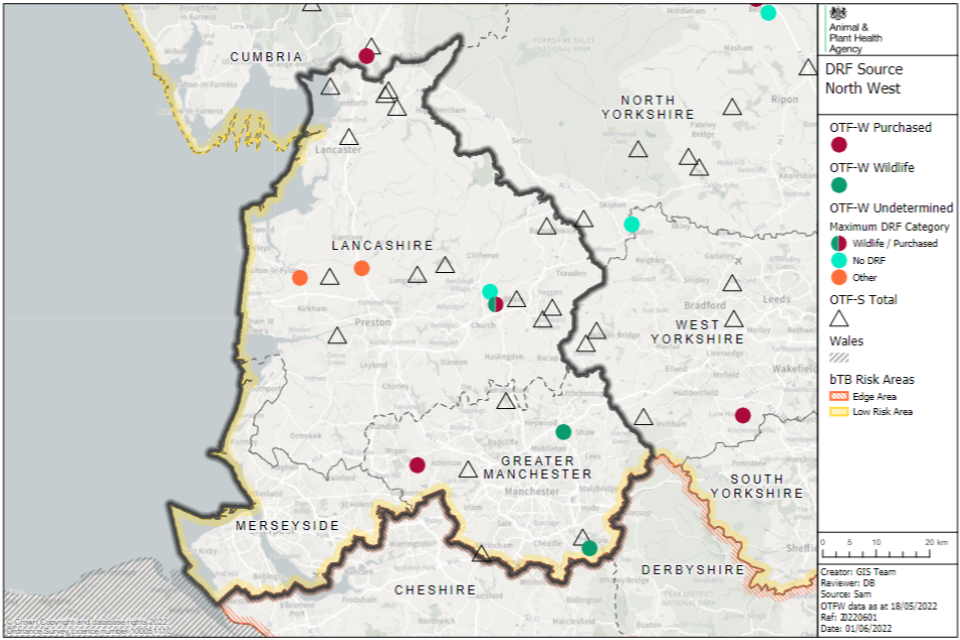 East Lancashire: 1 OTF-W likely due to wildlife or purchased cattle. North-west: 2 incidents of unknown source. Greater Manchester: 1 OTF-W in north-west likely due to purchased cattle. 1 Incident in north-east and 1 in south-east likely due to wildlife.