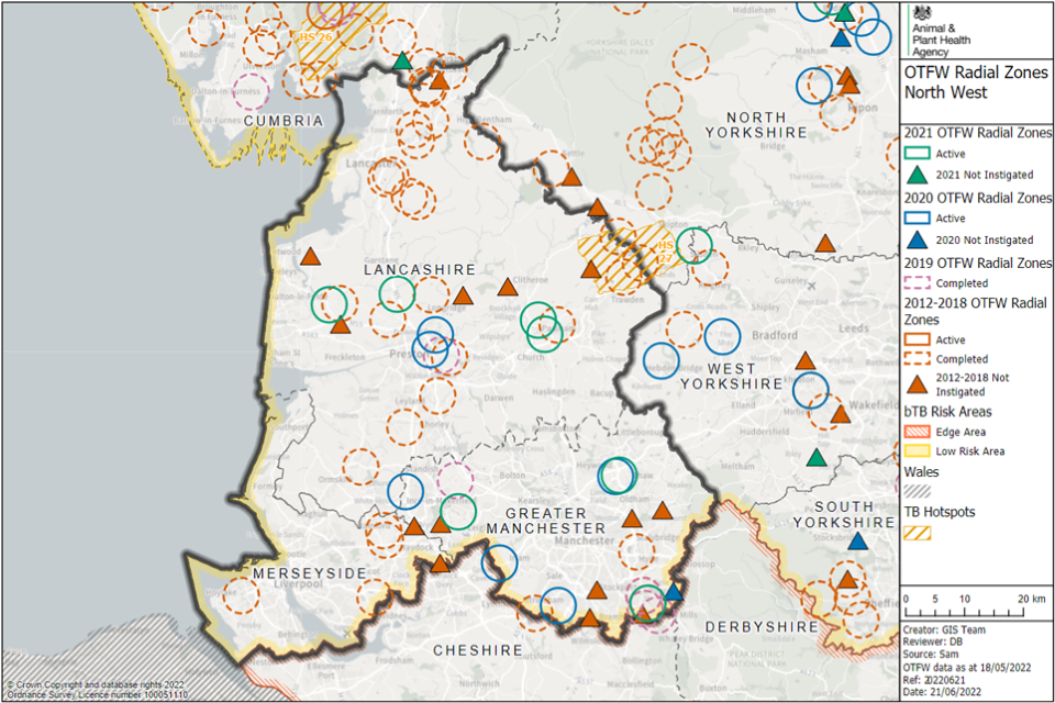 Figure 6: Potential hotspot areas and radial surveillance zones around OTF-W incidents that were active, completed or not instigated in the North West of England during 2021, by year of initiation.