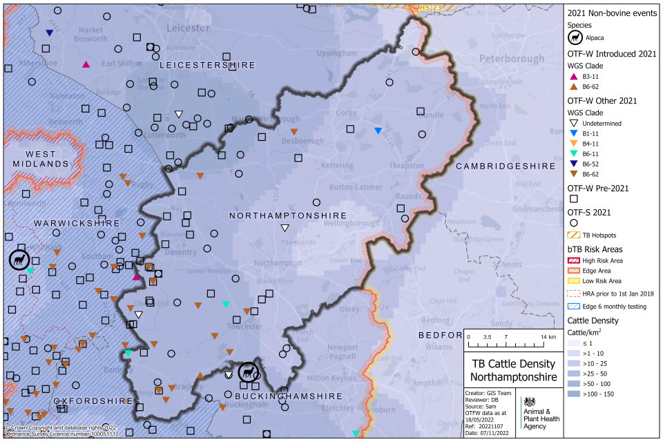 Most TB incidents in Northamptonshire in 2021 occurred in areas with higher cattle density.