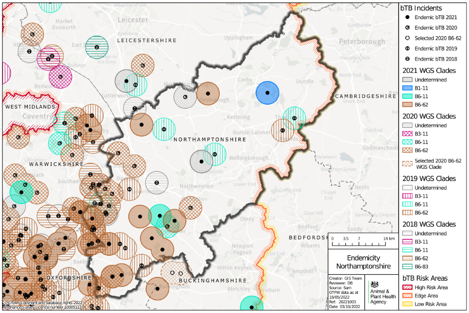 Additional information is provided by Whole Genome Sequencing (WGS) of M. bovis isolates from OTF-W herds. From this data, it is apparent that TB has become endemic in the west of the county. The presence of WGS clade B6-62 (which includes genotype 10:a, reported in previous years) is expanding across the Warwickshire and Oxfordshire borders into Northamptonshire, as shown in Figure 8.
