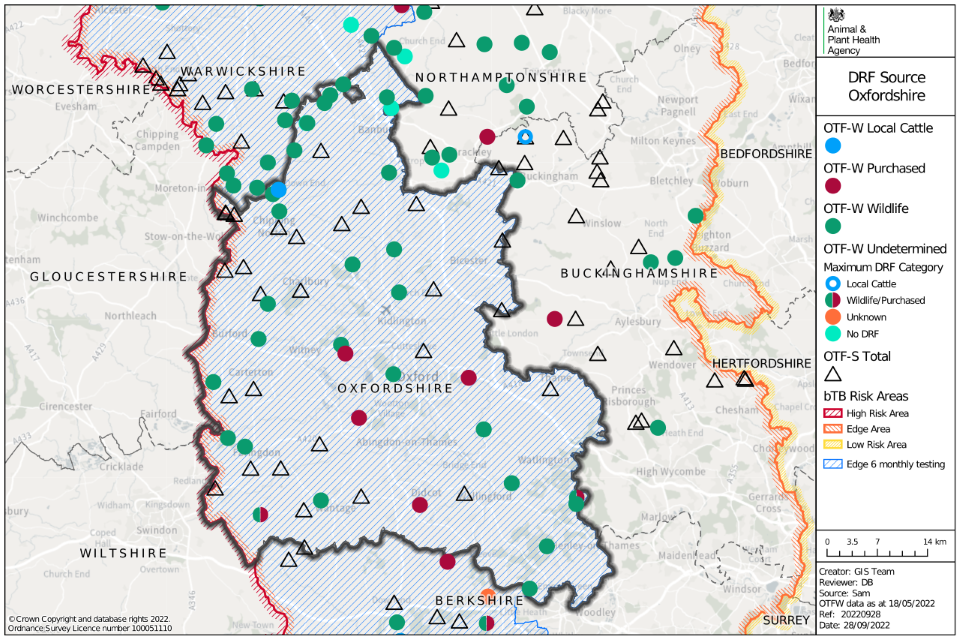 After ruling out purchased cattle and contiguous contact with neighbouring cattle herds, the most likely source of infection was attributed to wildlife, probably moving from the neighbouring HRA into Oxfordshire.