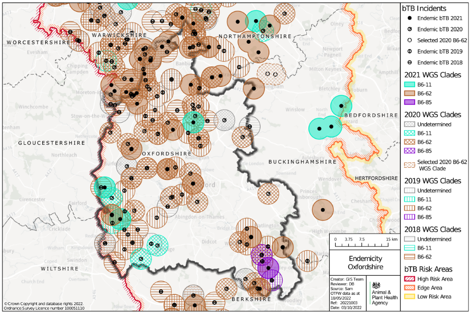 As shown in this report, APHA have identified a number of ‘clusters’ of TB infection in Oxfordshire. To tackle these areas of genetically-linked infection, Defra have launched a new ‘Oxfordshire Cluster Project’, starting in two areas (Deddington-Witney-Charlbury and Thame-Chinnor), formally from 1 October 2022. The project aims to give local farmers, veterinary practices, and other stakeholders the responsibility for design and delivery of locally tailored supplementary TB control measures in their area. It will be supported, facilitated, and funded by Defra and will draw on previous, similar projects’ successes.