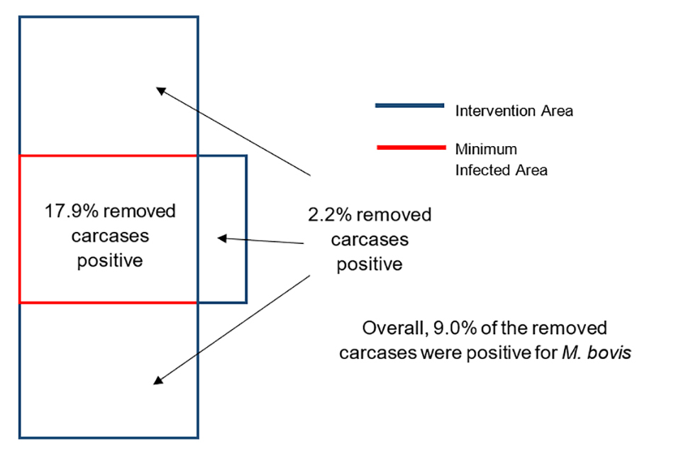 - an outer area, also based on estimated average badger social group territory size, surrounding the minimum infected area, to take into account the possibility that infection may have already spread in the badger population. The boundary was adjusted to adhere to natural barriers to badger movement as far as practical to minimise the risk of any possible perturbation effects