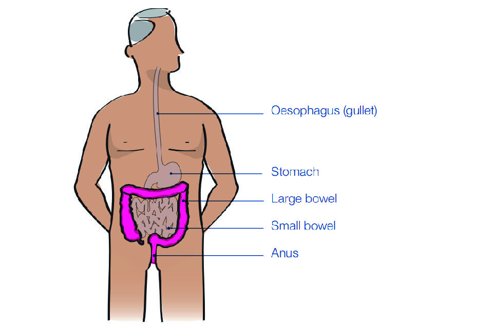 The bowel has 2 parts – the small bowel and the large bowel. The large bowel is coloured pink in the picture below.