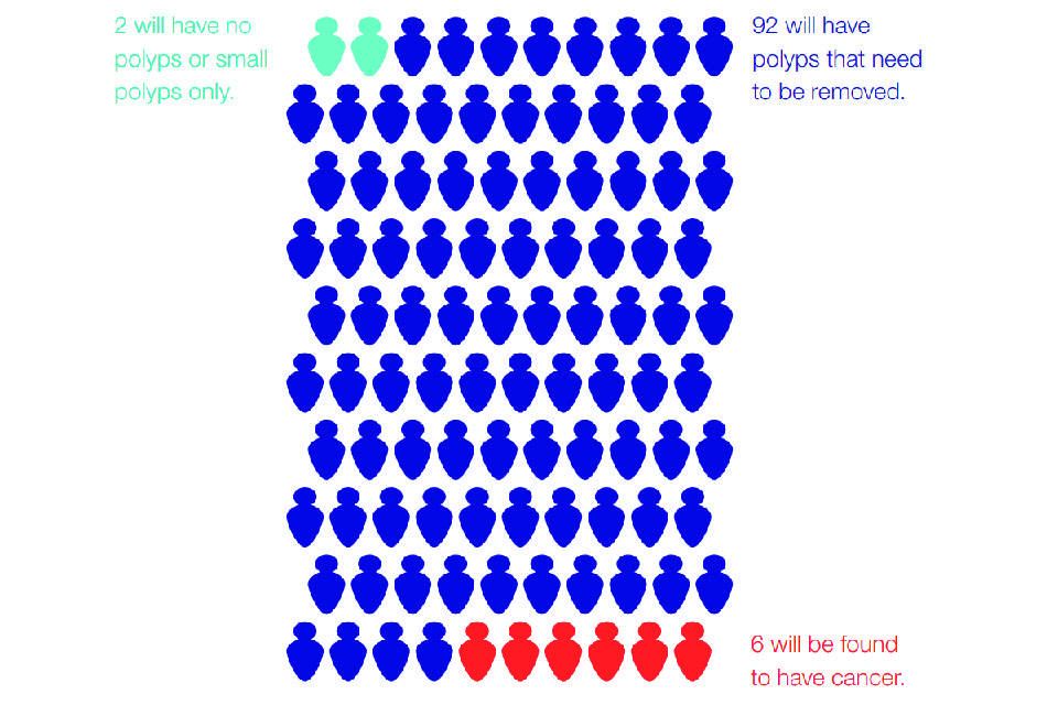 Diagram showing that for every 100 people having colonoscopy after bowel scope screening, 2 will have no polyps or small polyps only, 92 will have polyps that need removing, and 6 will have bowel cancer found.