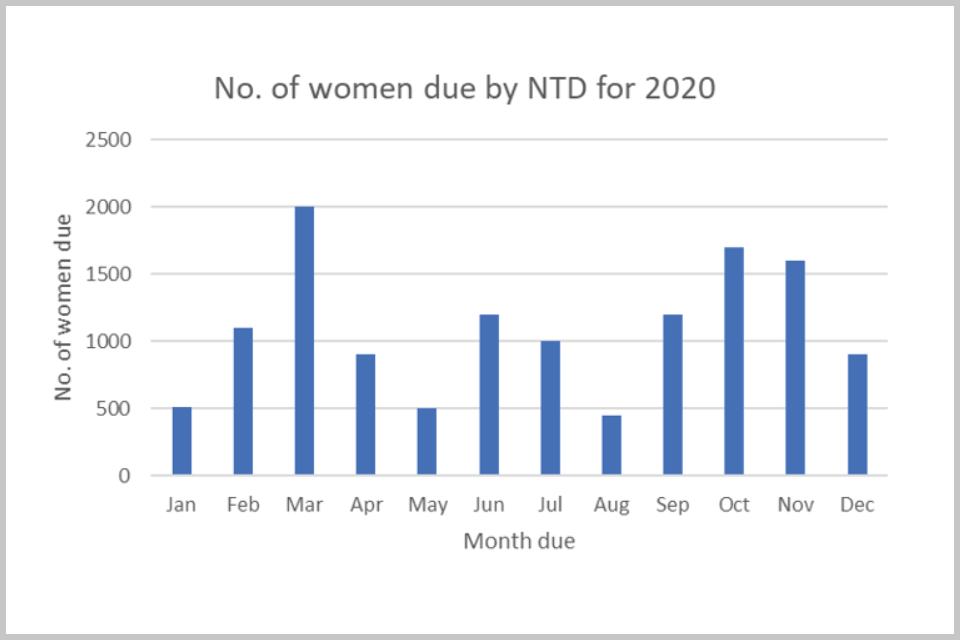 The NTDD screening estimate shows when people are due for screening within the specified dates. To be counted in the estimates a person must be eligible by date of birth and also NTDD, where they have one. Each person is only counted in one of the months of estimations.