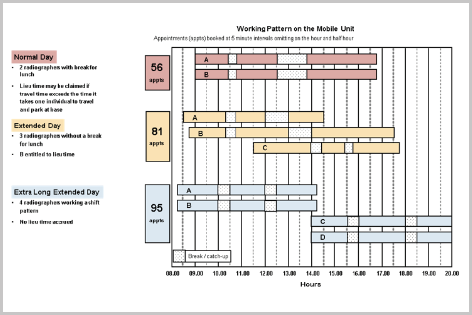 Figure 2 shows an example of a service that has developed 3 different lengths of working day. It operates between 8am and 8pm depending on which shift pattern is in operation.
