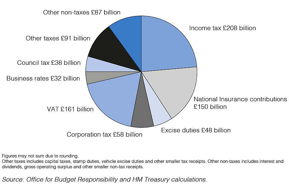 Chart 2 shows the different sources of government revenue. Public sector current receipts are expected to be about £873 billion in 2020-2021.