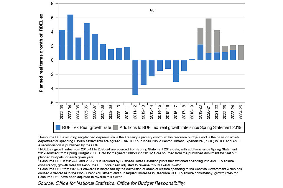 The Budget launches the Comprehensive Spending Review 2020 (CSR), setting out the overall level of public spending within which the CSR will be delivered. The CSR will conclude in July and will set out detailed spending plans for public services and investment, covering resource budgets for three years from 2021-22 to 2023-24 and capital budgets up to 2024-25.