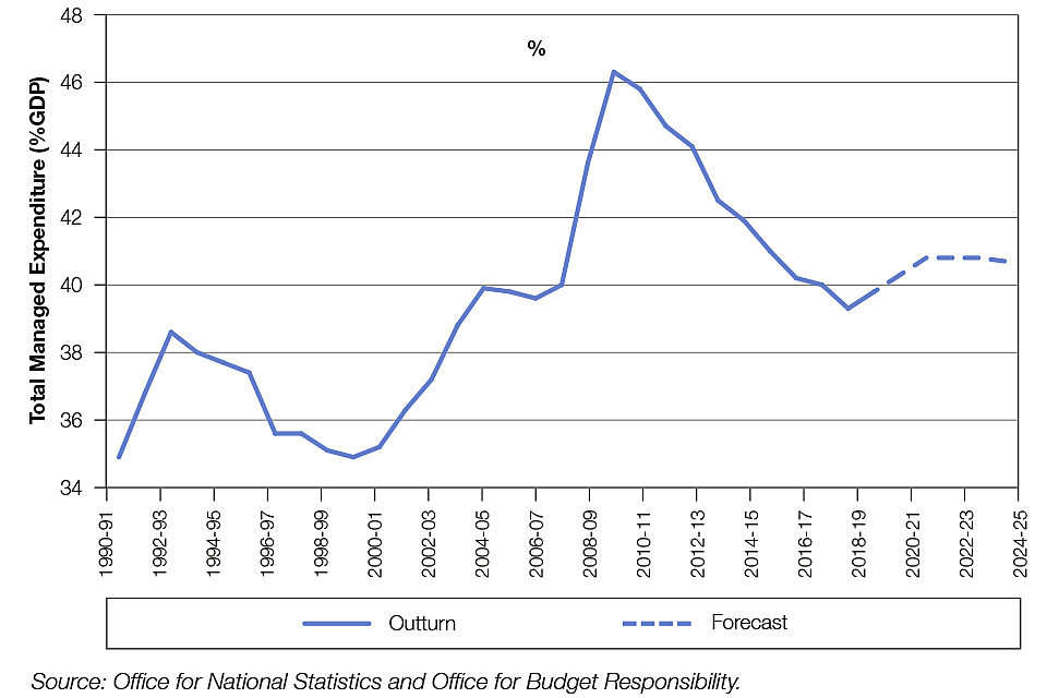 Chart 1 shows public spending by main function. Total Managed Expenditure (TME) is expected to be around £928 billion in 2020-2021.