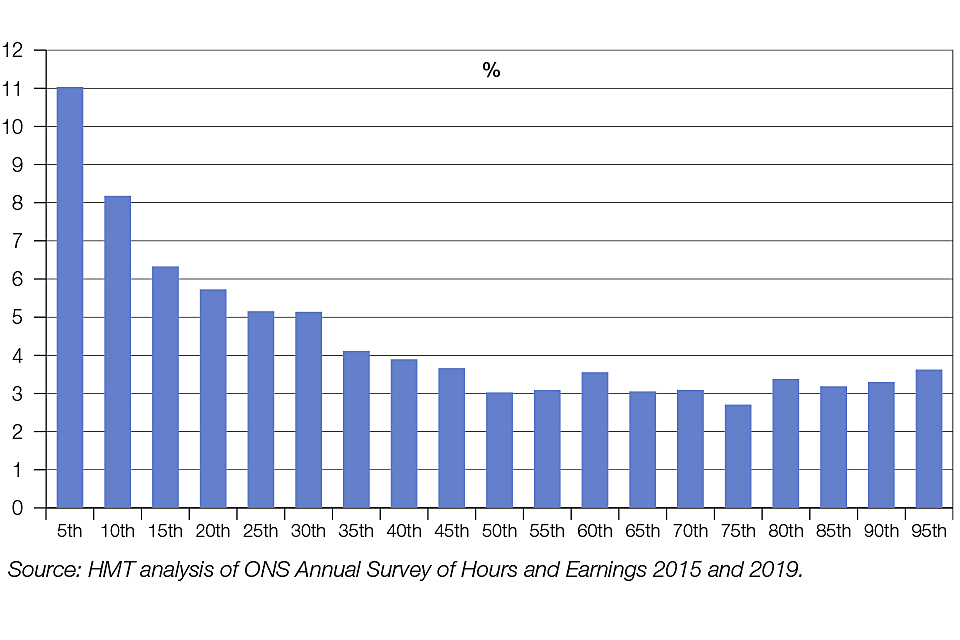 HM Treasury analysis of ONS Annual Survey of Hours and Earnings, 2015 results and 2019 results. ‘Lowest–paid full–time workers’ defined as those at the fifth percentile of the earnings distribution. ↩