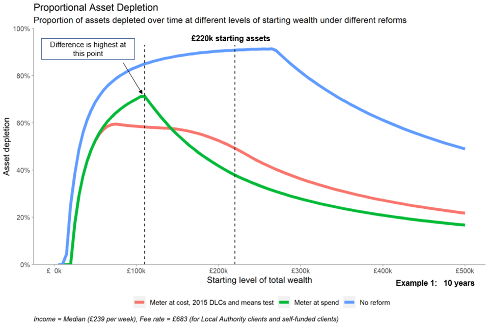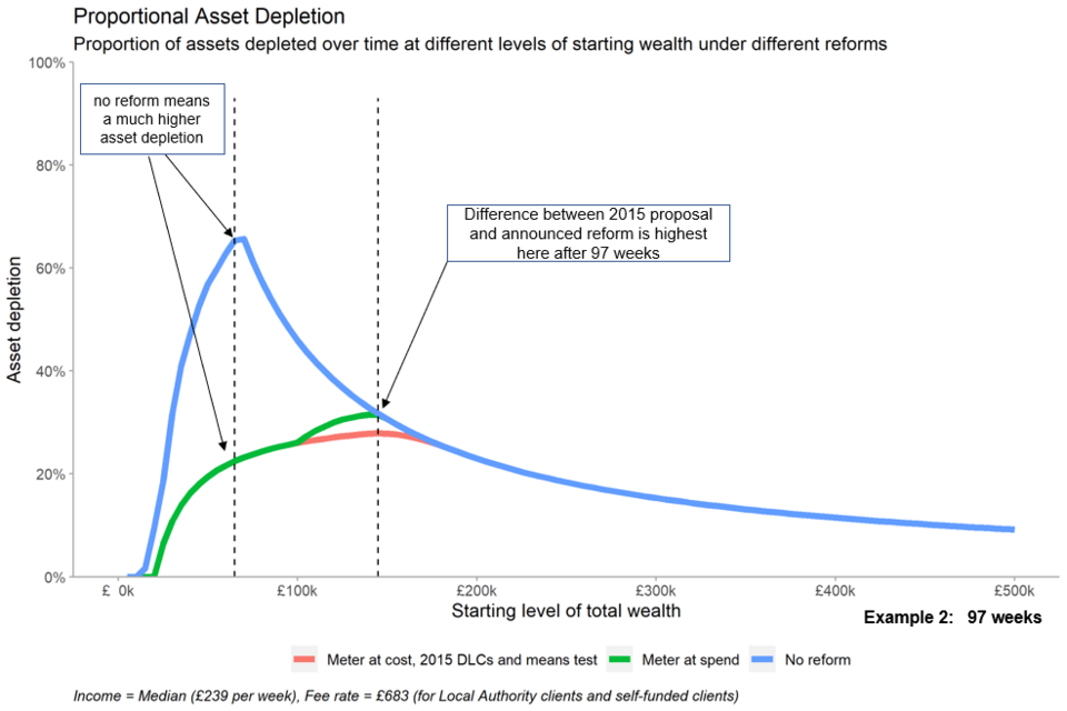 - under both the 2015 proposal and 2021 reform proposals, this same user would only deplete 22% of their assets in this time, as they are protected by the more generous means test, leaving them with around £51,000 at the end of their care journey